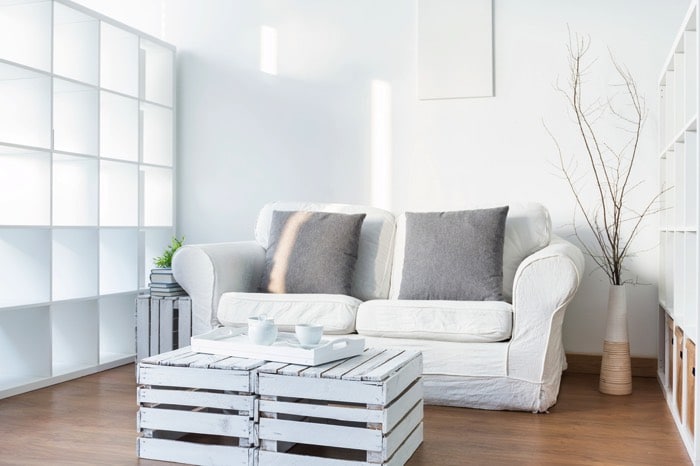 Meuble en palette tout en blanc servant de petite table rustique, livre avec couverture bleue dessus, fleur et poires dans une assiette. Mur en pierres blanches, parquet au sol et canapé gris sur le côté droit.