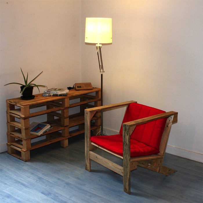 Transformation d’un meuble en palette en un autre. Comprenez par là, la transformation d’une table basse en palette en un fauteuil en palettes !