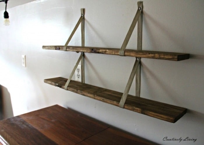 Des étagères en palette suspendues. un style industriel ici très prononcé avec la présence de métal pour les équerres.