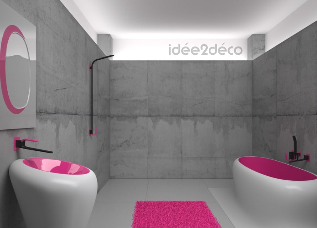 L’intérieur de la baignoire et du vasque sont d’une couleur rose pour un design moderne assuré. D’autres couleurs auraient elle aussi pu faire l’affaire comme dans une salle de bain bleu, une salle de bain verte, ou violette, …